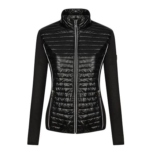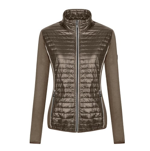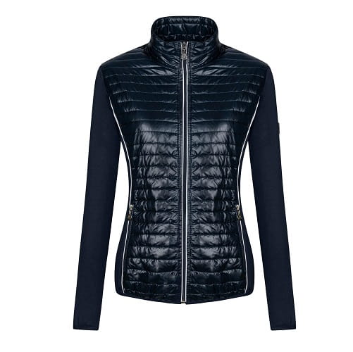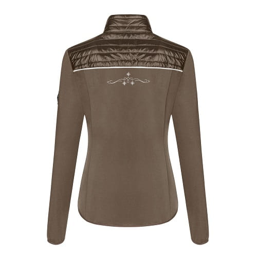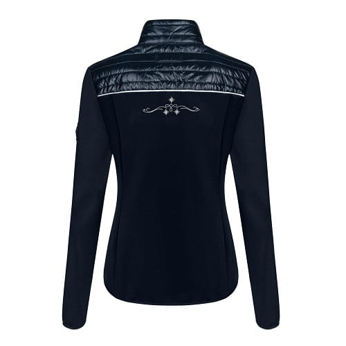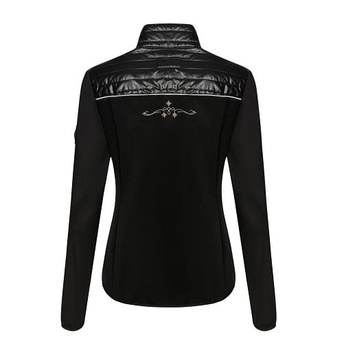Bluza damska wykonana z elastycznego softshellu. Z przodu i w górnej części pleców wstawki z lekko ocieplonej tkaniny pikowanej. Kobiecy krój, ładnie dopasowany do sylwetki. Z przodu dwie kieszenie zapinane na suwaki. Ozdobiona dyskretnymi haftami z dżetami