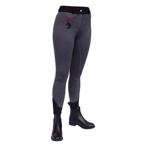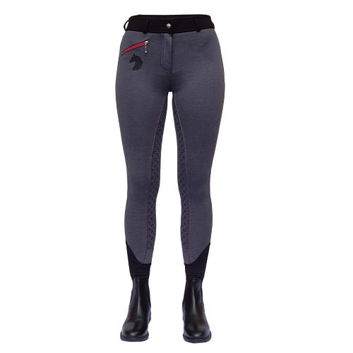 Bryczesy wykonane z elastycznego materiału, pełny silikonowy lej zwiększa przyczepność do siodła, jednocześnie nie krępując ruchów. Posiadają kieszonkę zapinaną na zamek. Zdobione brokatowym logiem York