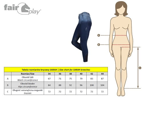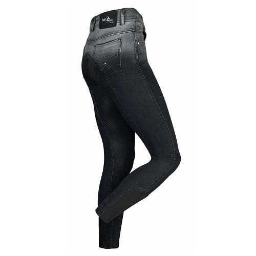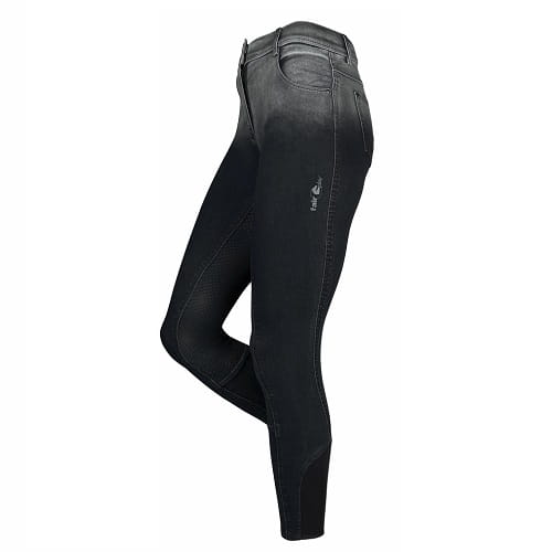 Bryczesy wykonane z elastycznego i wytrzymałego dżinsu z wysokim stanem. Pełny lej pokryty silikonem typu. Zakończone elastycznymi nogawkami