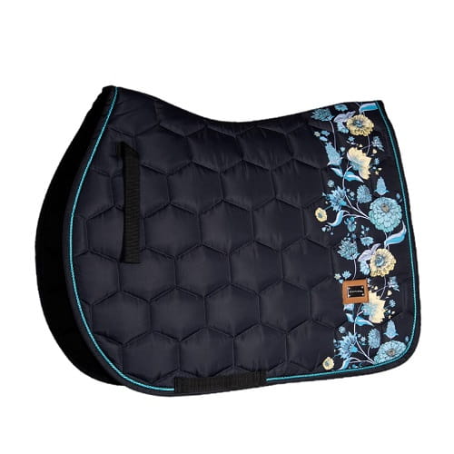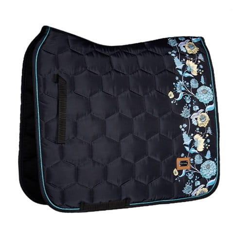 Czarny czaprak z turkusowo-żółtymi kwiatami. Wykonany z wytrzymałej tkaniny o charakterystycznym dla DotiBel satynowym połysku. Czaprak jest ozdobiony blaszką z nazwą naszej firmy oraz obszyty satynowym turkusowym sznurkiem. Wyprofilowany, anatomiczny kształt oraz paski do przystuł zapewniają idealne dopasowanie pod siodłem. Spód czapraka wykonany jest z wysokiej jakości, oddychającego materiału. Dzięki grubej warstwie wypełnienia czaprak doskonale amortyzuje pracę siodła. Każdy czaprak pakujemy w torbę wielorazowego użytku zamykaną na zamek błyskawiczny, która idealnie nadaje się do transportu i przechowywania czapraka.