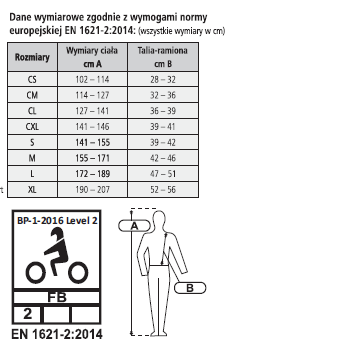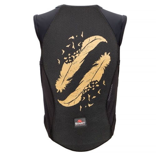 Kamizelka ochronna zabezpieczająca plecy oraz kość ogonową. Spełnia aktualne normy bezpieczeństwa:EN 1621-2:2014 LEVEL 2. Część ochronna wykonana jest z grubej pianki PVC, przód natomiast z elastycznej, oddychającej siateczki dopasowującej się do sylwetki. Kamizelka jest lekka i zapewnia swobodę ruchów podczas jazdy. Dodatkowo na plecach nadruk z motywem piórek.