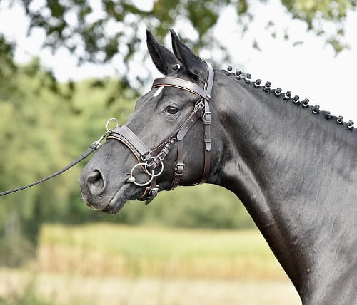 Kawecan firmy Busse. Wykonany z wysokiej jakości skóry, miękko podszyty w części potylicznej, na naczółku i nachrapniku. Wyposażony w pierścień w centralnej części oraz dwa wymienne pierścienie po bokach. W komplecie z dwoma śrubami chicago oraz dodatkowym paskiem do wędzidła który można dopinać na odpowiedniej wysokości. Posiada regulacje wielkości w kilku miejscach umożliwiająca najlepsze dopasowanie rozmiaru. Wszystkie sprzączki posiadają skórzane podkładki chroniące skórę konia.