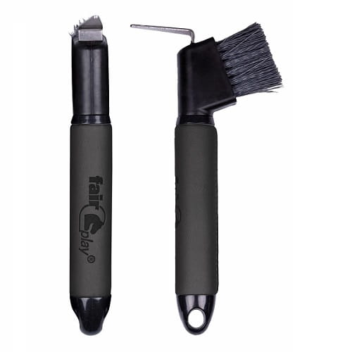 Elegancka kopystka do czyszczenia kopyt. Wyposażona w metalowy skrobak oraz szczoteczkę ze sztywnego włosia. Rączka wykończona imitacją skóry z tłoczonym logo Fair Play
