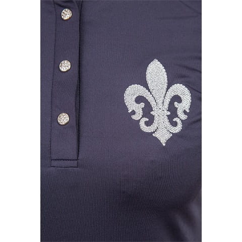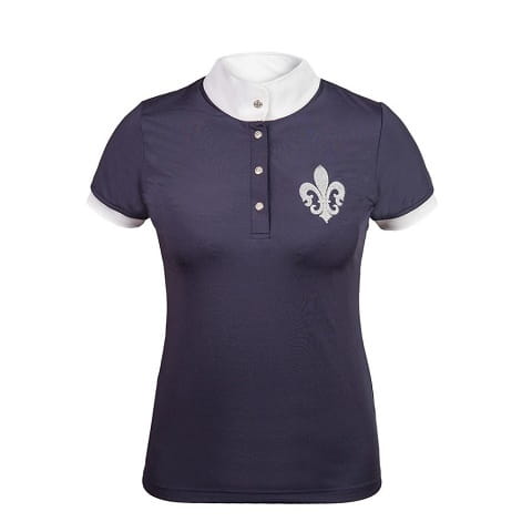 Damska koszulka konkursowa z krótkim rękawem. Wykonana z wysokiej jakości technicznego materiału, który pozwala na idealne dopasowanie. Wyposażona w piękne guziki z kryształkami oraz emblemat na piersi. posiada kontrastowy kołnierzyk i wykończenie na rękawie.
