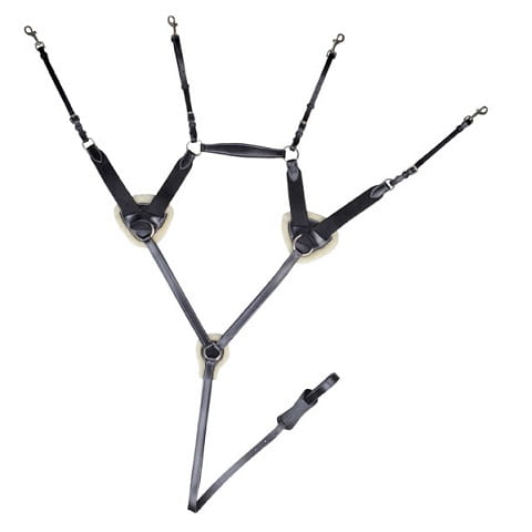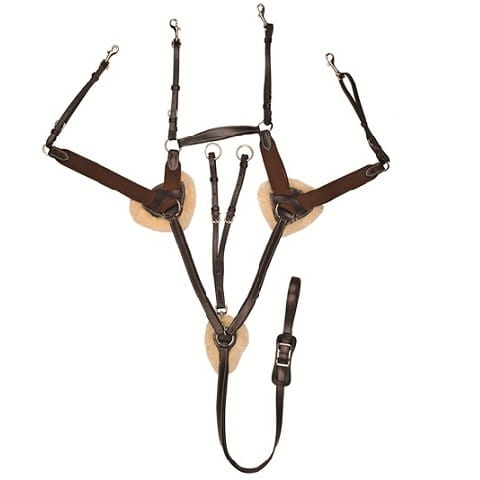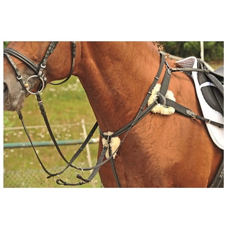 Napierśnik 5-cio punktowy wykonany z wysokiej jakości skóry z elastycznymi wstawkami. Posiada podszycie z owczej wełny w największym miejscach ucisku. Wytok wypinany. Futerka również można odpiąć w celu wyprania.
