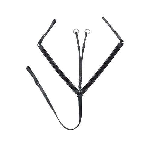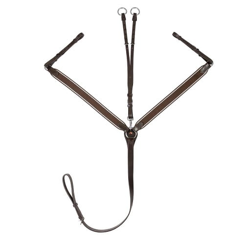 Skórzany napierśnik z regulowanym, wypinanym wytokiem. Po bokach wyposażony w solidne, szerokie gumy dla lepszego dopasowania.Zapinany na klasyczne sprzączki wykonane ze stali nierdzewnej.
