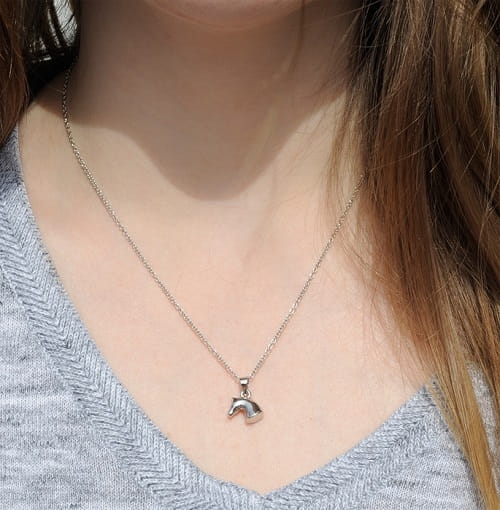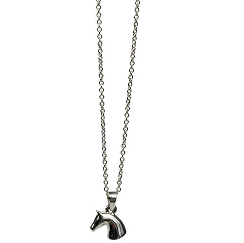 Bardzo ładny wisiorek ozdobiony trójwymiarowym wisiorkiem w kształcie końskiej głowy. Nie zawiera niklu. Sprzedawany w metalowym pudełku. Długość łańcuszka: 42 cm.