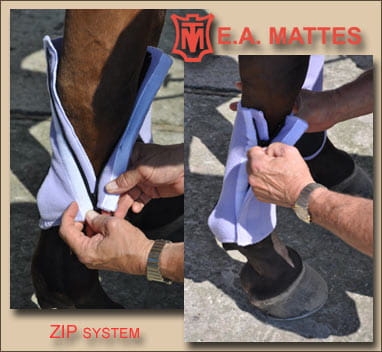 Połączenie owijek i ochraniaczy dostępne w pełnej gamie kolorystycznej E.A. MATTES. Owijki zapinane na zamek błyskawiczny wypełnione są wewnątrz filcem grubości 5 mm. Szybkość i łatwość zakładania oraz dodatkowa ochrona to pewne atuty tego kolorowego produktu.