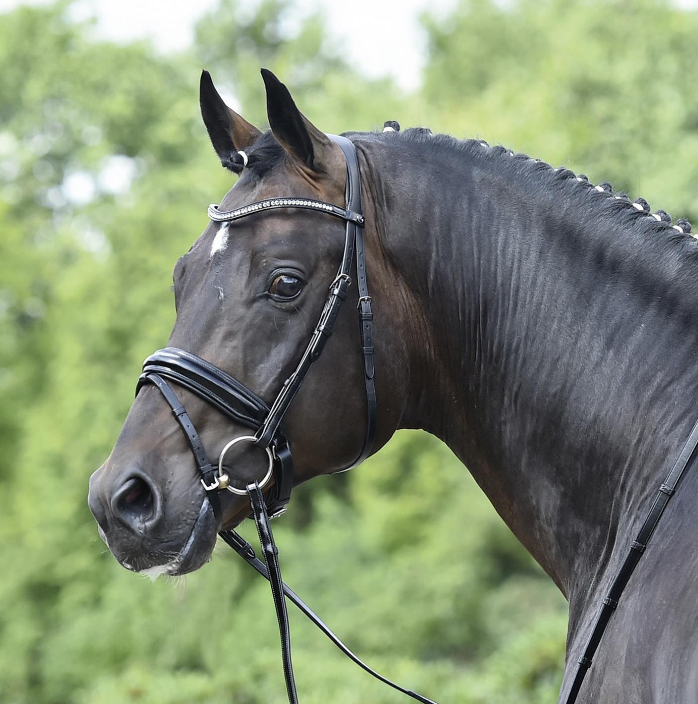 Ogłowie firmy Busse to: optymalna funkcjonalność, piękny wzór, wykonane z najlepszej włoskiej skóry uzdowej. Pro nature: wykonany głównie ze skóry garbowanej roślinnie. Pasek potyliczny o anatomicznym kształcie, miękko podszyty, szeroki, zapewniający optymalne rozłożenie nacisku. Nachrapnik przypinany z obu stron do paska potylicznego. Bardzo szeroki nachrapnik szwedzki, zwężany po bokach, miękko podszyty, z wierzchu skóra lakierowana, sprzączki z tulejami, podkładka pod żuchwę. Naczółek wygięty, ozdobiony błyszczącymi sztucznymi kryształkami. Podgardle regulowane obustronnie. Haki do pasków do wędzidła, okucia ze stali szlachetnej