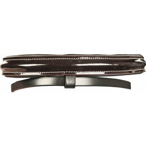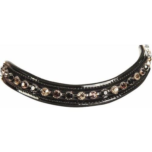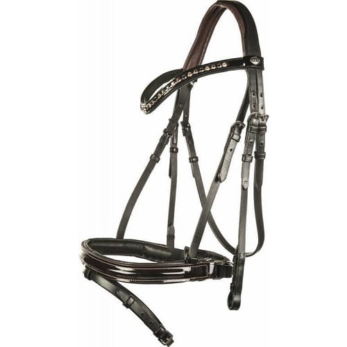 Ogłowie HKM wykonane ze skóry bydlęcej, podszyta część nosowa i potyliczna, stabilne, srebrne sprzączki. Nachrapnik szwedzki, naczółek z syntetycznymi diamencikami, wodze parciane z małymi stoperami. Miękkie podszycie w kontrastującym kolorze, skóra lakierowana na naczółku i nachrapniku. Zdobienie kontrastującym kolorem z haczykami do uzdy