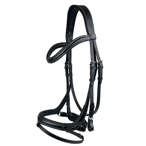 Wysokiej jakości anatomiczne ogłowie, wykonane z naturalnej, miękkiej skóry, szeroki i miękko podszyty nagłówek zapewnia lepszy rozkład nacisku oraz swobodę za uszami konia. Dodatkowe miękkie podszycia na nachrapniku i naczółku zapobiegają obtarciom i niwelują dyskomfort. Anatomiczny kształt nachrapnika zapewnia więcej swobody przy kościach policzkowych i wrażliwych zakończeniach nerwowych na głowie konia. Kontrastowe przeszycia dodają elegancji i wyjątkowego wyglądu. Wodze gumowo-skórzane w zestawie