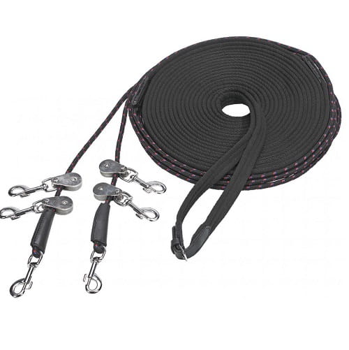 Podwójna lonża firmy Busse. Miękka, przyjazna dla skóry. Z obu stron zakończona sznurkiem 3 metrowym. Cztery rolowane karabińczyki na sznurku. Obrotowe końcówki.