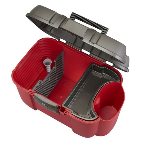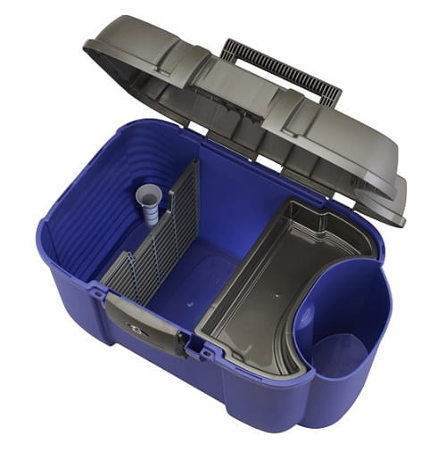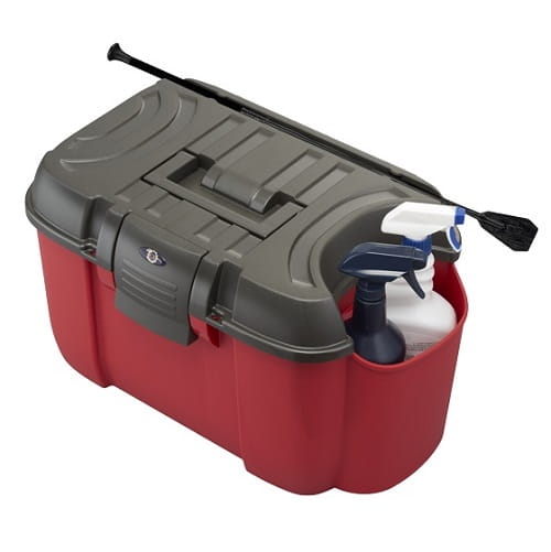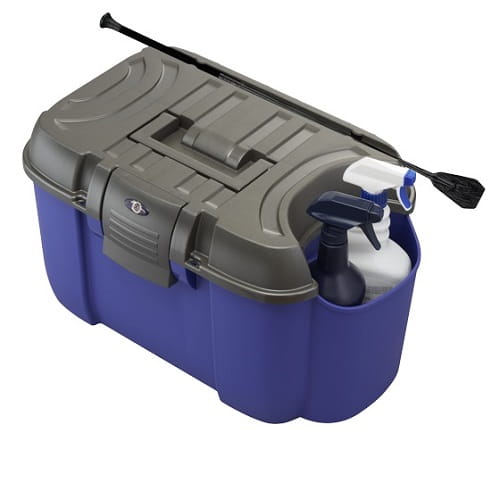 Skrzynka jeździecka z dodatkową przegrodą na np. preparaty w butelkach. Pokrywa wytrzymuje ciężar do 210 kg, więc można na niej usiąść. Wewnątrz posiada wyjmowaną półeczkę oraz przegródkę i zatyczkę na pędzel. Możliwość zapięcia na kłódkę. Skrzynki sprzedawane bez zawartości widocznej na zdjęciu, t.j. preparaty w butelkach i bat.