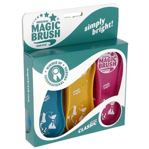 Zestaw oryginalnych szczotek Magic Brush, niezbędna pomoc przy efektywnej pielęgnacji koni! Specjalne włosie szczotki doskonale dopasowuje się do kształtu ciała konia i dokładnie zbiera kurz, zabrudzenia, piasek, przeczesując sierść i pozostawiając skórę czystą, a włos lśniący i gładki.